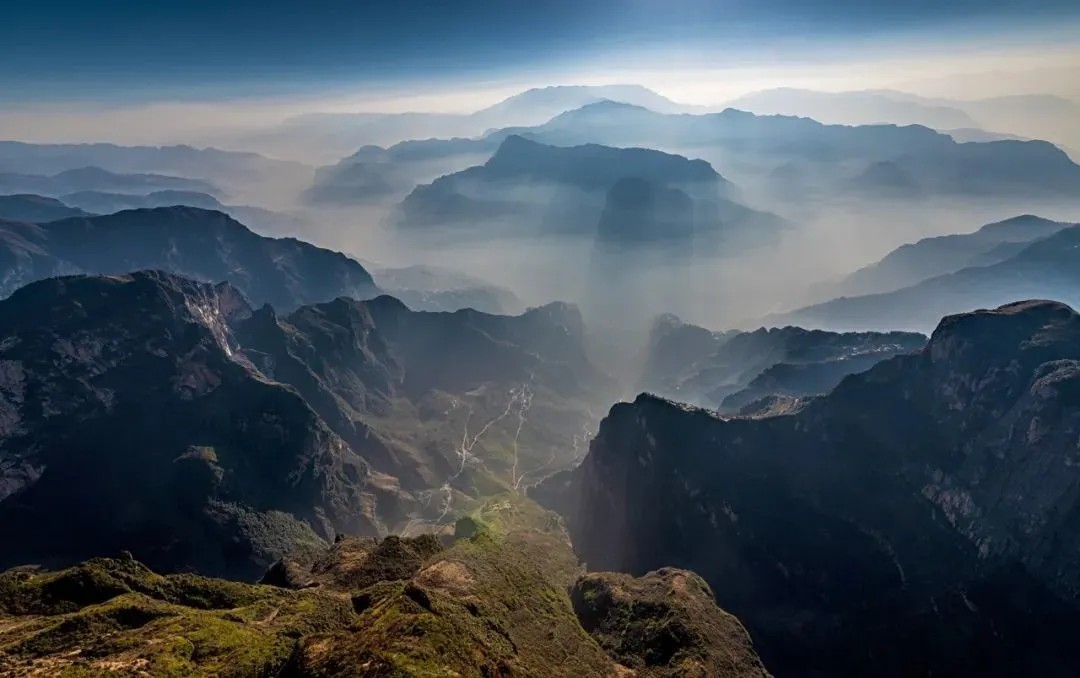 大山包里最出片的,要数鸡公山玄武岩大峡谷。这条峡谷垂直落差超过2600米,山脊如刃,绝壁如削。站在“玻璃跳台”上往下看,是万丈深渊;往远望,是云海浮动、山影层叠。看着这般人间仙境,心慢慢就沉静下来了。