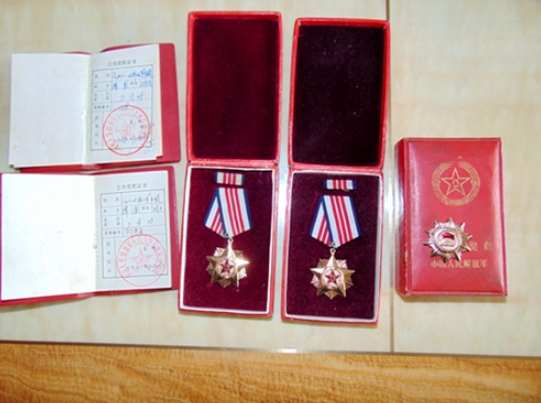 图为:谭勇荣立两次“三等功″的两枚军功章及荣获一枚“社会主义精神文明积极分子先进个人″奖章。