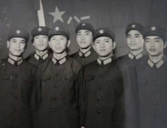 图为:谭勇同铁道兵第五师二十团副政委何海滨、政治处主任杨兴发、军务股股长熊运印、军务股参谋蒋立仁、李均平、谢忠福合影。