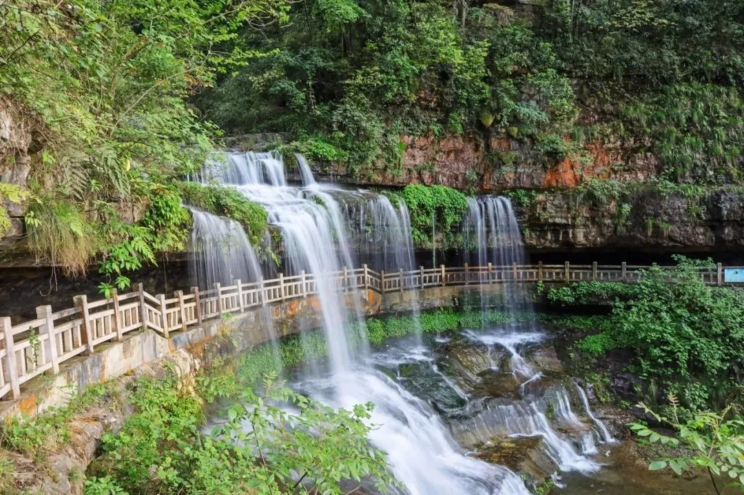 山景云海之外,还有飞瀑成群。黄连河瀑布群位于大关县东南,汇聚47条大小瀑布。最壮观的是“情郎瀑”,落差高达142米,宛如白练,从山崖一泻而下。行走在瀑布之间,不自觉就把暑气抛洒在山林之间。