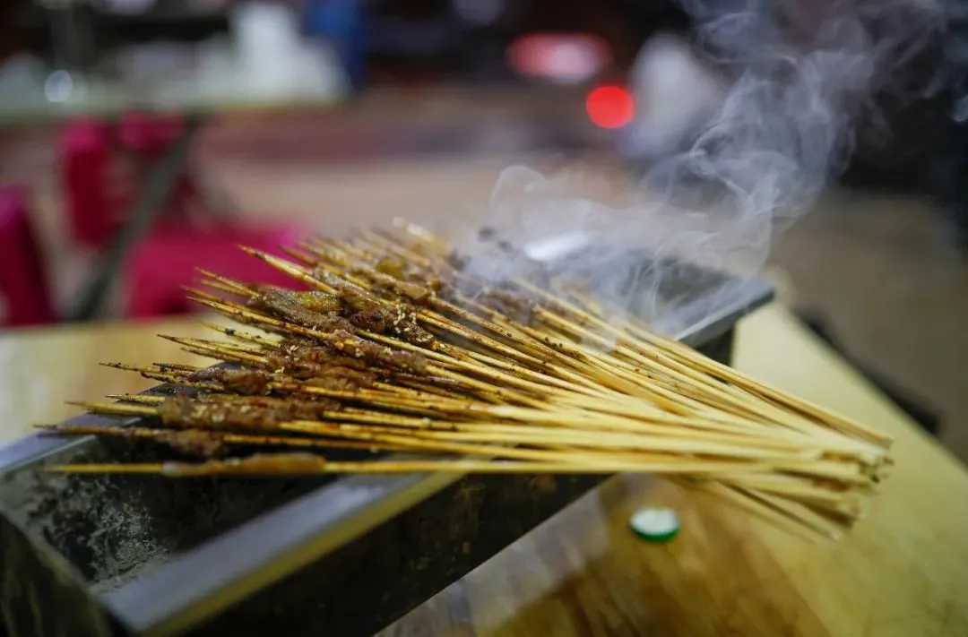 昭通美食里最出名的是小串,毕竟纪录片《人生一串》夸它是“烧烤的艺术”。夜晚最常见的画面,是一张矮桌、几把小凳、十几串烤得滋滋冒油的牛肉小串。本地人管小串烧烤叫“把把烧”,师傅一手抓着十多个牛肉小串在炭炉上翻转,客人也是三十串、五十串那样下单。