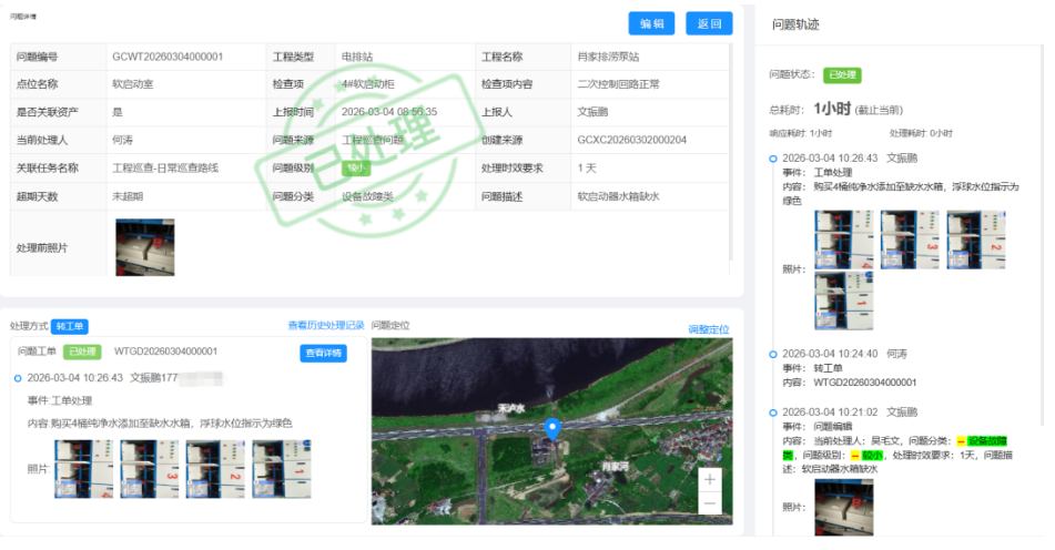 针对排查发现的问题,平台会自动建立电子台账、明确整改时限与责任主体,整改全过程线上留痕,经核实确认后方可销号,有效解决“责任不清、整改拖延”的顽疾。安全管理同步实现数字化转型,纸质档案升级为动态“数字档案”,为消防器材、特种设备建立专项健康档案,到期自动提醒检测维保;对水库、泵站等关键风险点实行“一源一档”管理,将隐性风险转化为可监测、可预警、可管控的明确对象,全面提升安全管理精细化水平。